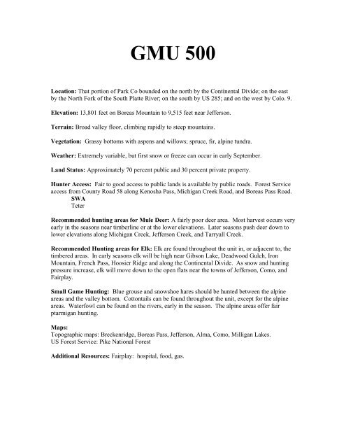 GMU 500 Colorado Division of Wildlife Colorado.gov